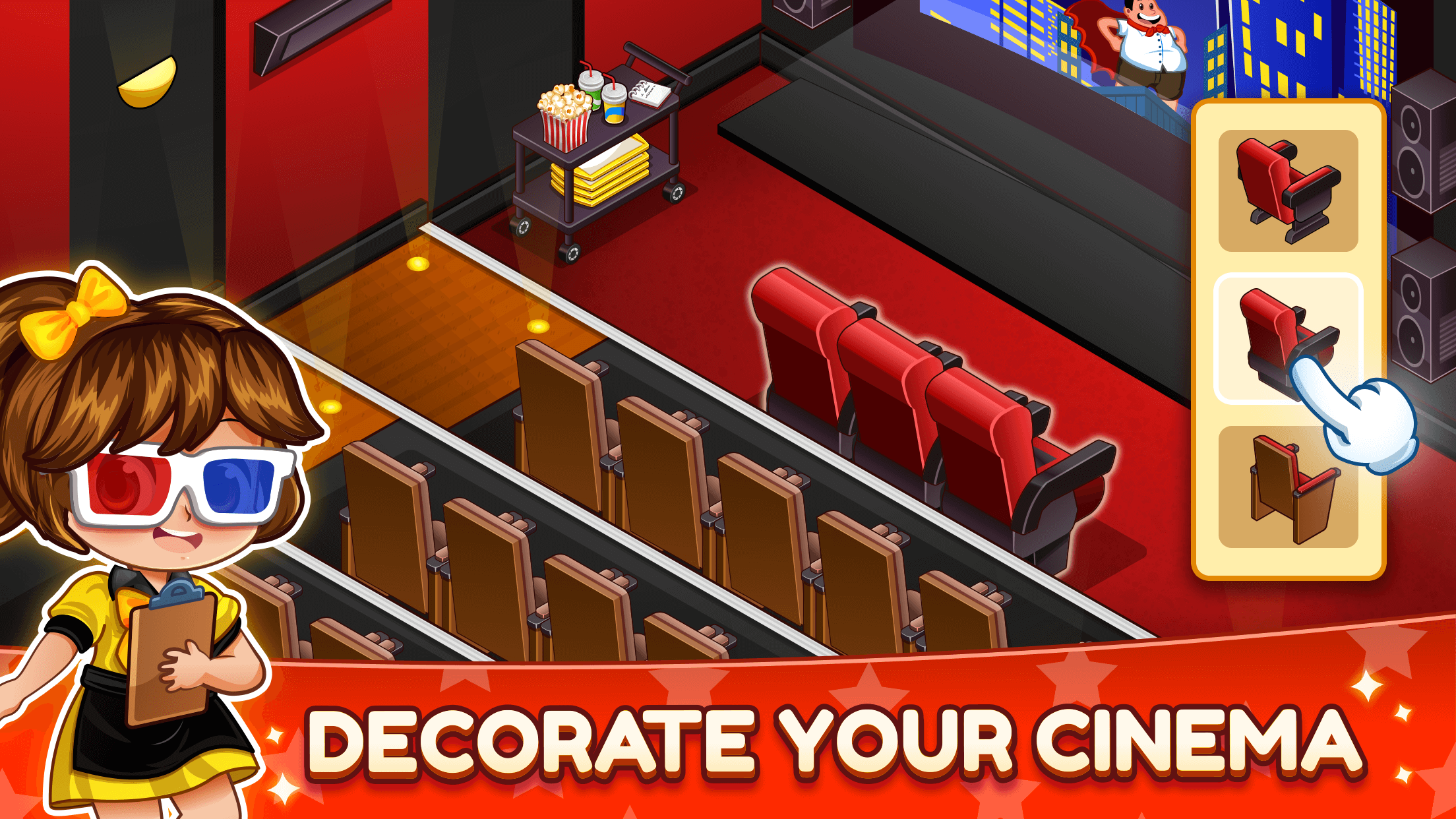 Customize your theater with decorations and furniture. Design your cinema your way to attract more customers and increase profits.